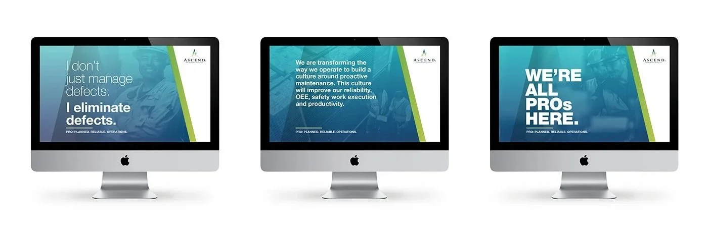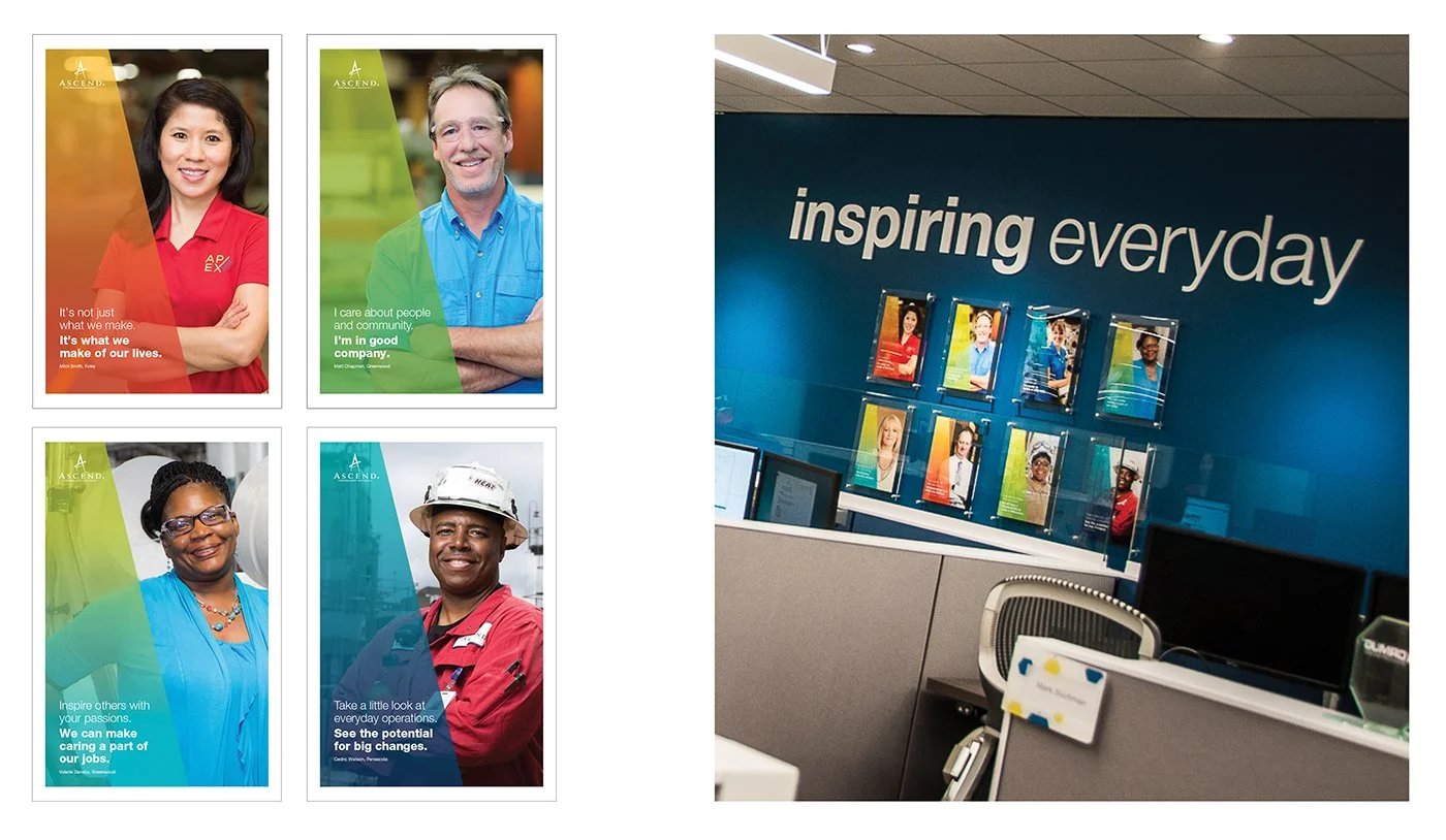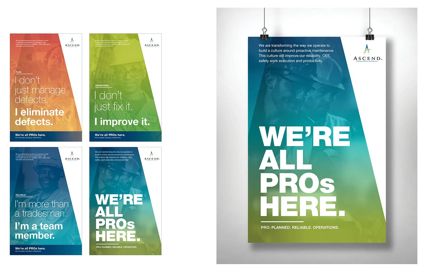 I helped develop a bold new look using bright colors, gradients, and a dynamic diagonal element inspired by the “A” in Ascend. This updated style was applied across a range of projects, including brochures, an internal campaign, a lobby display, office wall graphics, and a visual identity guide for future use.